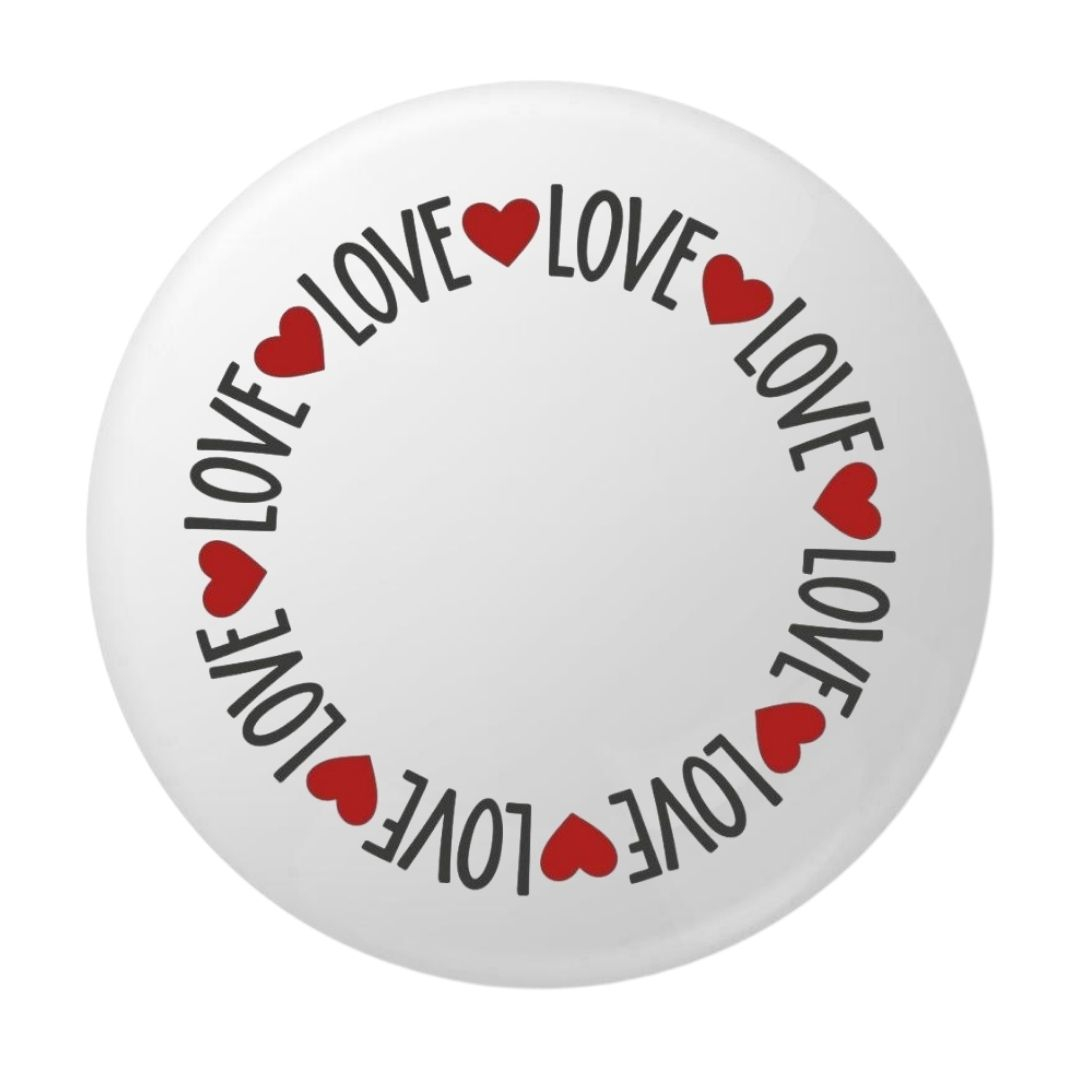 Textul Love este dispus armonios pe margine, alternand cu inimioare rosii intense, oferind un contrast placut intre grafica neagra si elementele decorative. Aspectul simplu, dar bine structurat, face ca insigna sa fie usor de integrat in orice stil vestimentar.