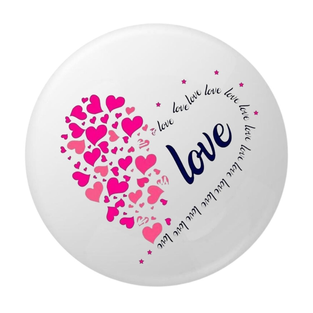Insigna rotunda „Love” este un accesoriu romantic si expresiv, conceput pentru a transmite iubire intr-un mod vizual puternic. Designul evidentiaza o inima formata din multiple inimioare roz si fucsia, dispuse armonios pentru a crea un efect dinamic si atragator.
