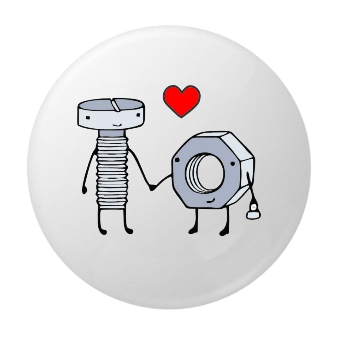 Aceasta insigna rotunda ilustreaza intr-un mod creativ si amuzant un surub si o piulita tinandu-se de mana, sub o inimioara rosie simbolica. Designul transmite ideea de compatibilitate perfecta si legatura puternica dintre doua persoane care „se potrivesc” una cu cealalta.