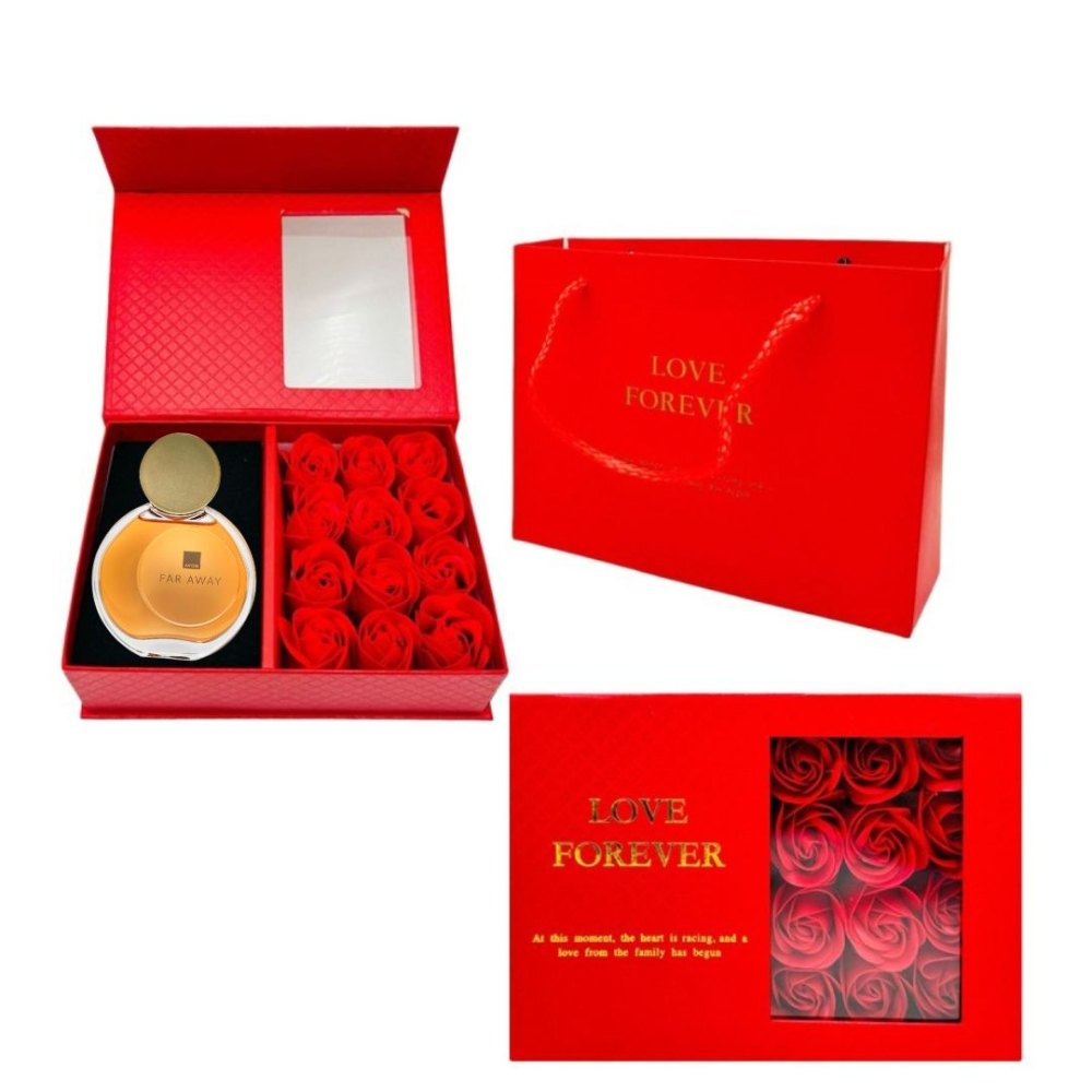 Cutia cadou Love Forever imbina estetica romantica cu rafinamentul unui parfum clasic feminin. Trandafirii de sapun rosii ofera un impact vizual puternic si un simbol al iubirii, iar cutia decorativa cu fereastra transparenta transforma setul intr-un cadou memorabil.