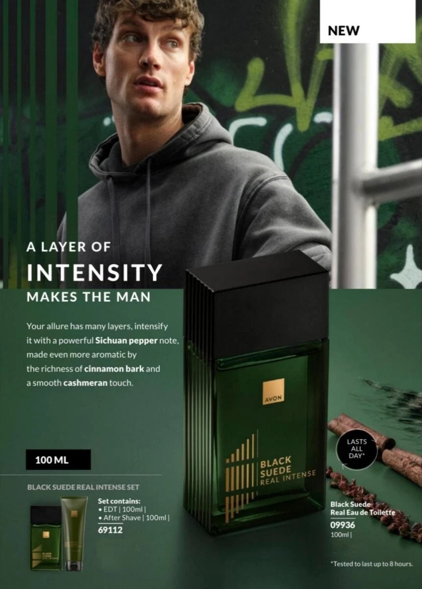 Traieste intensitatea autenticitatii masculine cu Avon Black Suede Real Intense pentru barbati, o apa de toaleta care evidentiaza forta, eleganta si magnetismul natural al barbatului modern. Aceasta versiune intensificata a clasicului Black Suede Real aduce o aroma mai profunda si mai persistenta, conceputa pentru cei care doresc sa lase o impresie puternica si memorabila.