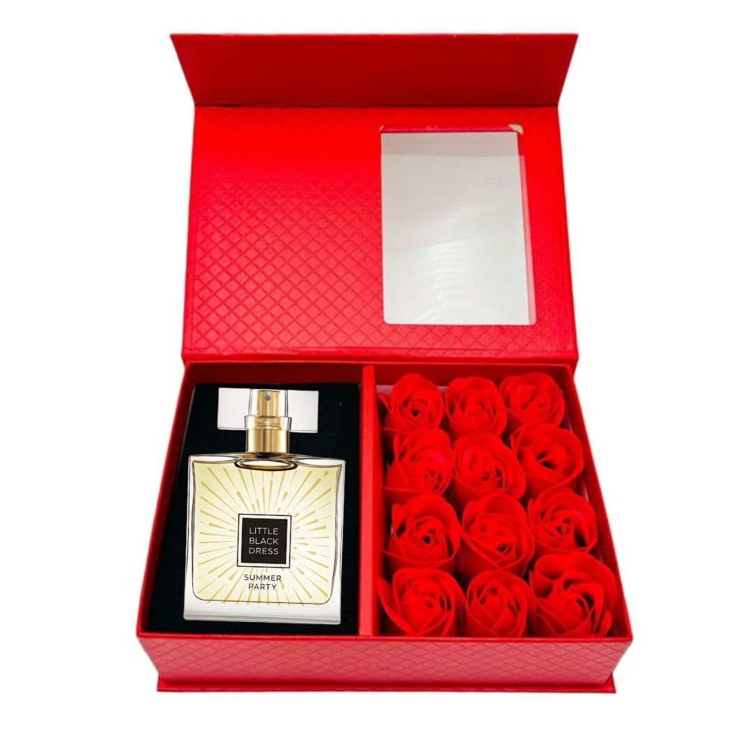 Cutie cadou Love Forever cu 12 trandafiri de sapun si apa de parfum Avon Little Black Dress Summer Party pentru femei 50 ml, cadou elegant si rafinat