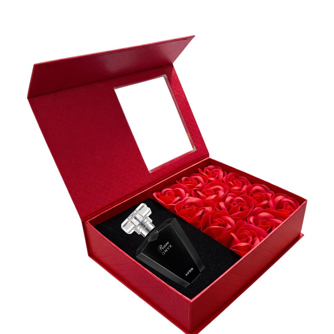 Cutie cadou Love Forever cu 12 trandafiri de sapun si apa de parfum Avon Rare Onyx pentru femei 50 ml, parfum floral-oriental ambrat, cadou elegant si rafinat