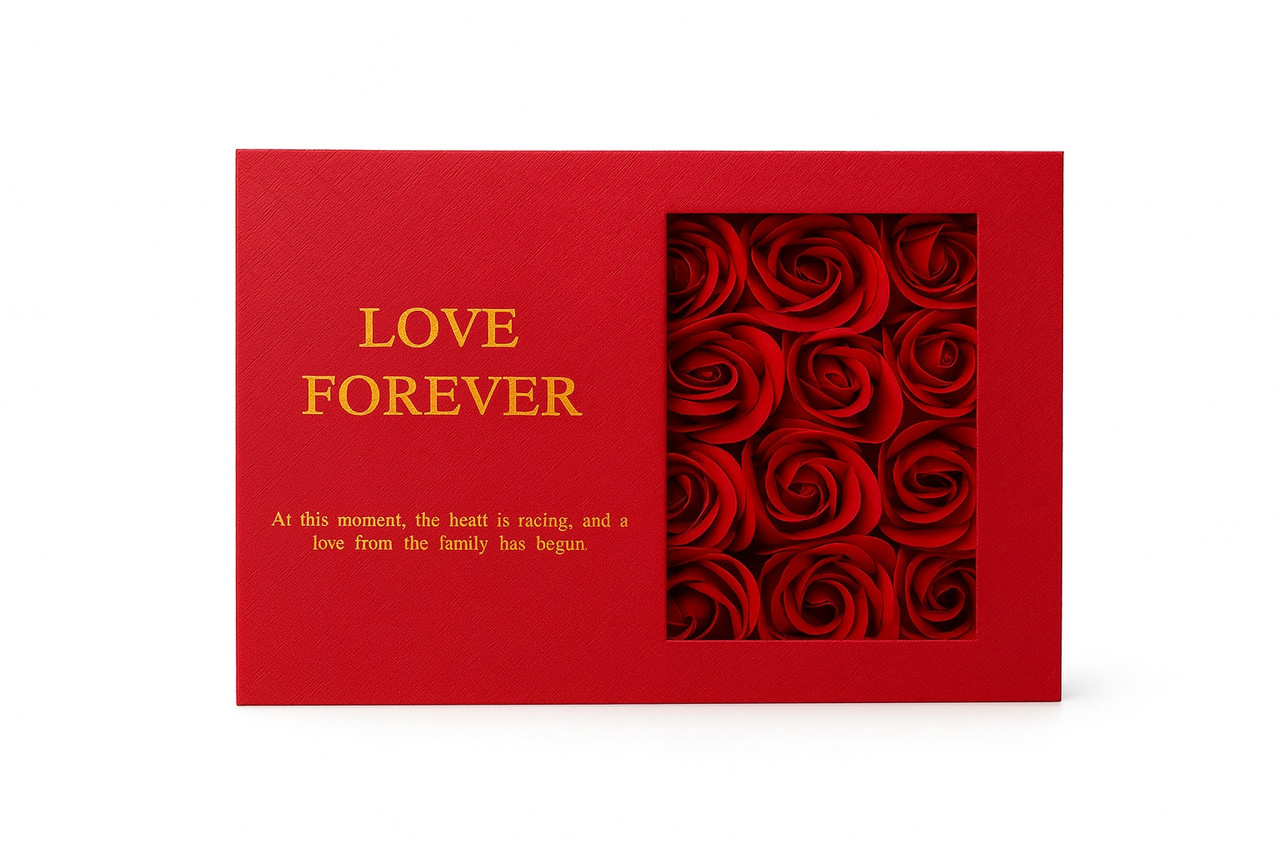 Cutia rigida, de culoare rosie, este decorata cu mesajul Love Forever si dispune de un capac cu fereastra transparenta, care permite vizualizarea continutului fara a fi deschisa. In interior se regasesc 12 trandafiri de sapun rosii, cu aspect realist, simbol al iubirii durabile. Acestia nu necesita intretinere si isi pastreaza forma si culoarea in timp, iar cutia poate fi reutilizata ulterior ca obiect decorativ sau pentru depozitarea bijuteriilor ori a altor accesorii personale.