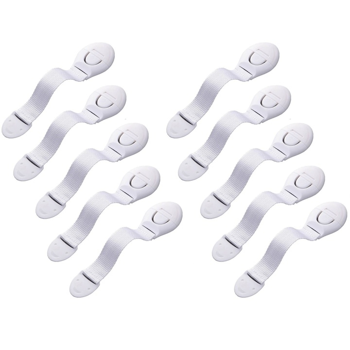 Set sigurante pentru usi si sertare, flexibile textile, ajustabile, cu adeziv 3M, pentru dulap, frigider, cuptor si mobilier, 10 bucati, alb