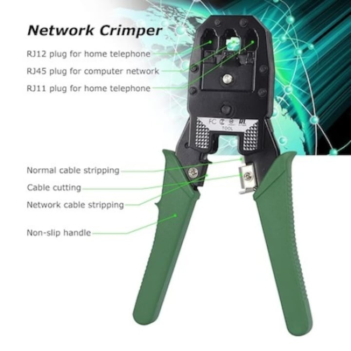 Clestele de sertizare 3 in 1 (8P/6P/4P) este fabricat din otel magnetic durabil, avand functie de sertizare, taiere si dezizolare. Este compatibil cu cablurile Cat5 / Cat5e / Cat6 si mufele corespunzatoare. Setul include si unelte suplimentare precum stripper universal, cutit coaxial, cutit de curatat si un instrument push-in pentru instalare rapida.