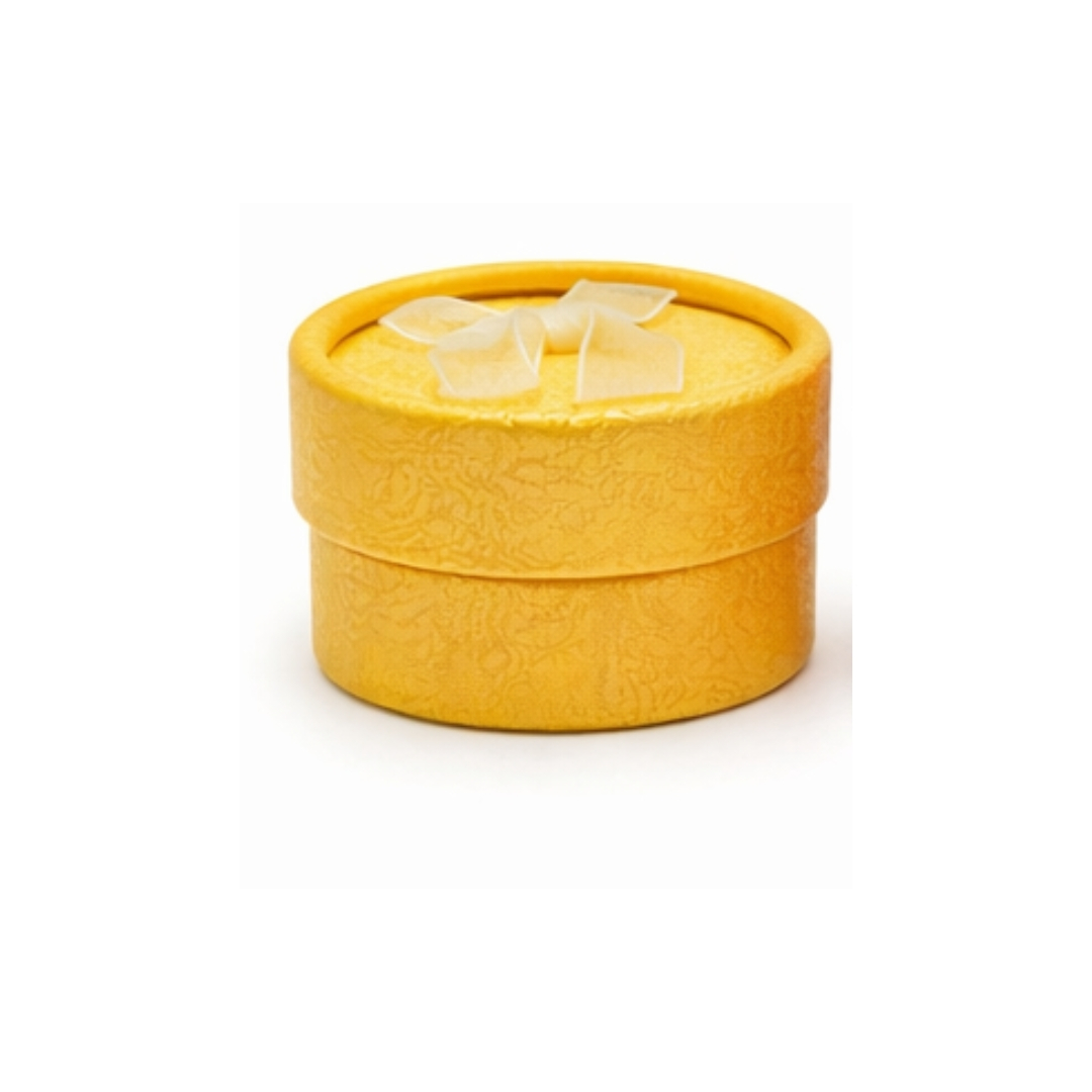 Cutiuta cadou rotunda galbena, cu diametrul de 5 cm, ideala pentru ambalarea bijuteriilor, martisoarelor sau cadourilor mici. Aspect vesel, forma compacta si utilizare versatila.