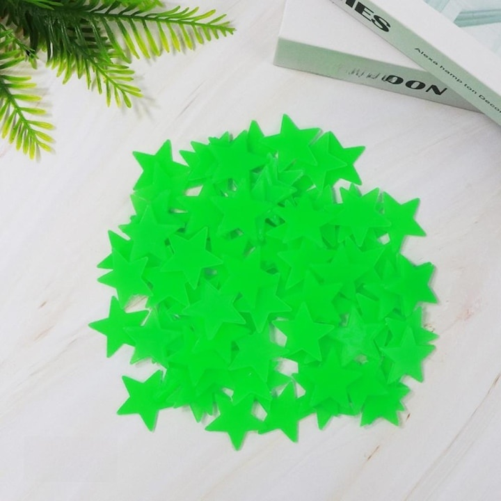 Set 100 stelute fosforescente, autoadezive, decoratiuni pentru camera copilului, plastic, 2.5 cm x 3.2 cm x 0.1 cm, verde
