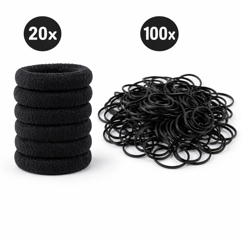 Include 20 elastice textile pentru fixare mai confortabila si 100 elastice subtiri din cauciuc pentru prindere precisa si stabila. Toate au aceeasi dimensiune, fiind usor de utilizat si combinat.