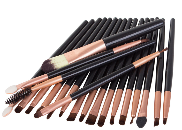 Set 20 pensule machiaj profesionale, peri sintetici moi, maner negru cu finisaj rose gold
