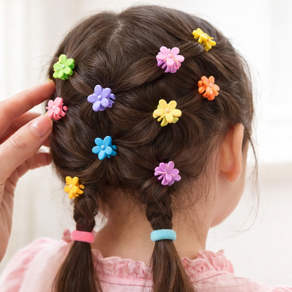 Set practic de accesorii pentru par, ideal pentru coafuri lejere, impletituri si prinderi rapide. Include 25 elastice textile cu diametru de aproximativ 1.5 cm si 16 cleme mini florale de 0.8 cm, potrivite pentru suvite subtiri si detalii decorative.