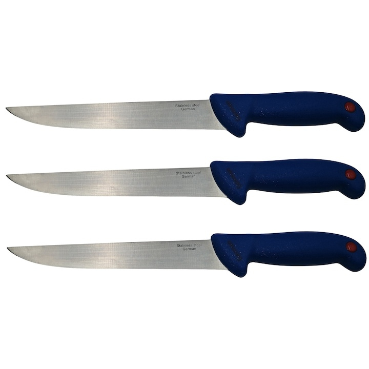 Set 3 cutite bucatarie tip Chef, otel inoxidabil, lama 19 cm, lungime 33 cm, maner ergonomic albastru, utilizare intensiva