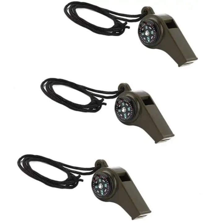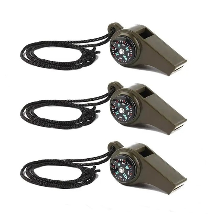 Set 3 fluiere supravietuire 3 in 1 cu busola si termometru, ABS rezistent, cordon inclus, verde 6 cm