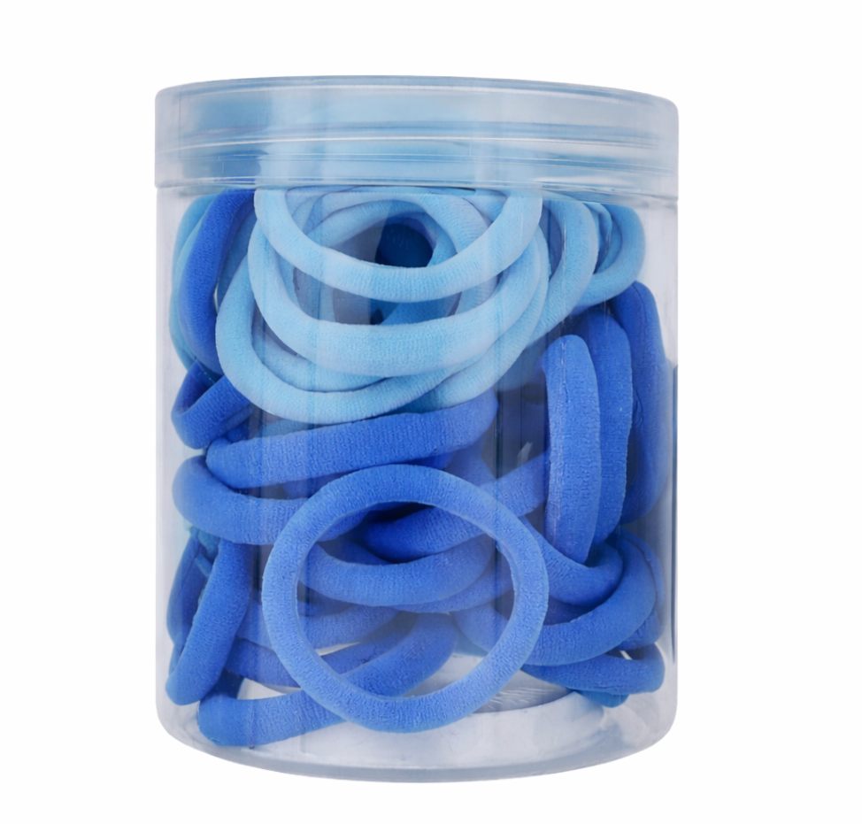 Set 50 elastice par textile, nuante de albastru, diametru 5 cm, pentru prindere par, cutie depozitare