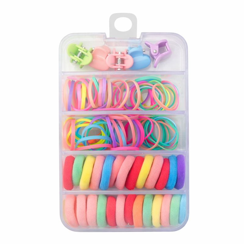 Set accesorii par copii cu cutie organizator, 26 elastice textile 2 cm, 80 elastice cauciuc multicolore si 5 cleme inimioara 0.8 cm