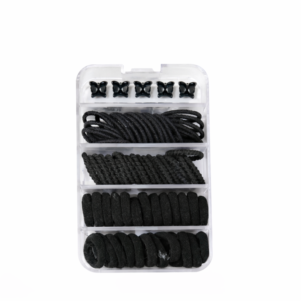 Set accesorii par negre, 26 elastice groase, 40 elastice subtiri, 5 cleme fluturas, elastan, 1.5 cm, organizator inclus