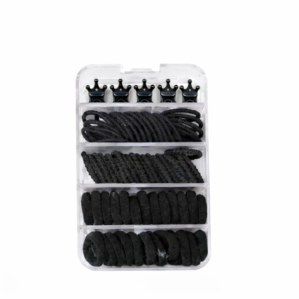 Set accesorii par negre, 26 elastice textile, 40 elastice cauciuc si 5 cleme mini, organizator compartimentat