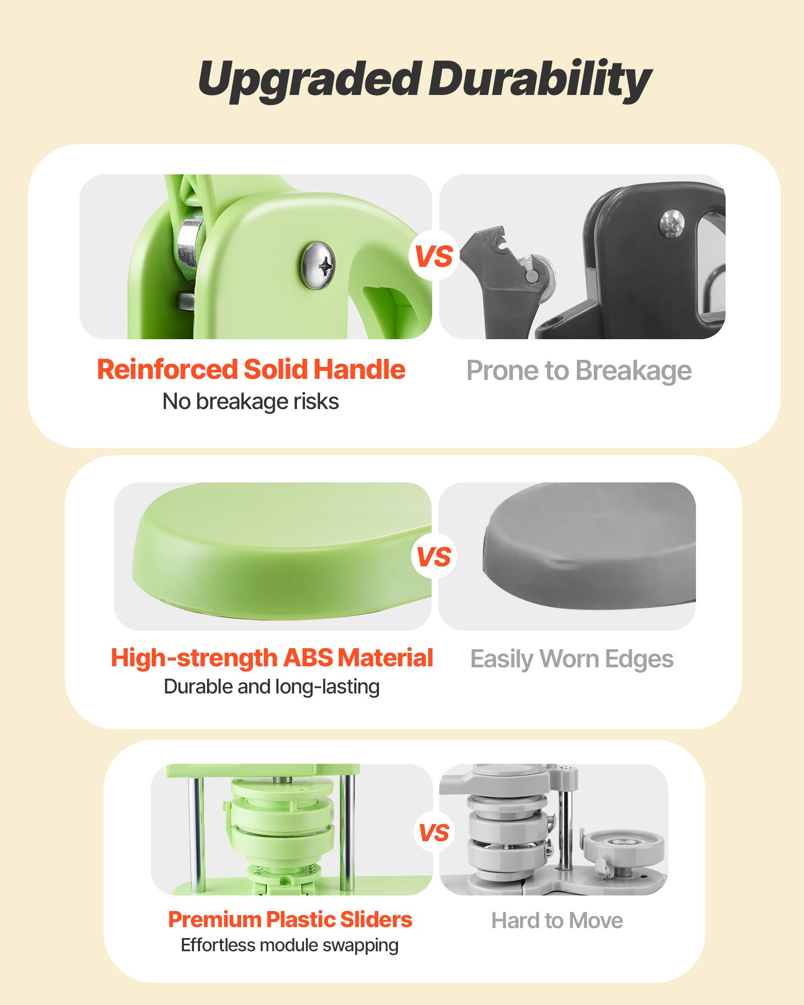 Manerul ergonomic, ranforsat, cu insertie antiderapanta, reduce efortul si face procesul de presare stabil si confortabil. Corpul este realizat din ABS durabil, cu ranforsari interne care rezista presarii repetate, asigurand utilizare indelungata. Mecanismul este intuitiv, astfel incat chiar si adolescentii pot folosi aparatul cu usurinta, bucurandu-se de activitati creative.