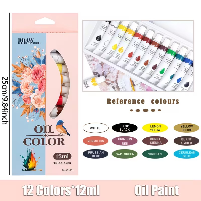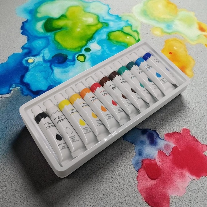 Set culori pictura ulei 12 nuante vibrante 12 x 12 ml pentru panza, lemn si hartie, vopsea artistica non-toxica pentru hobby si arta