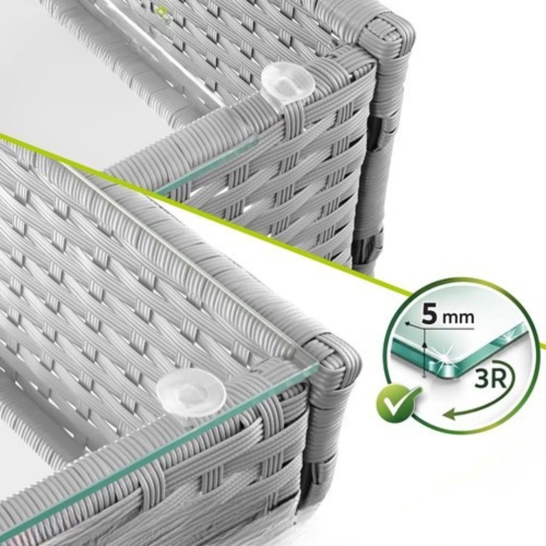 Setul este proiectat pentru a rezista la factori externi, fiind rezistent la raze UV si conditii meteo, fara decolorare sau deteriorare rapida. Blatul mesei din sticla securizata adauga un plus de eleganta si functionalitate.