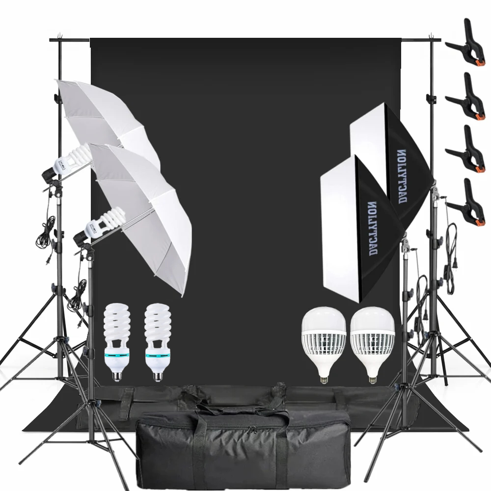 Set studio 4 Trepiezi 2 Softbox cu Becuri Spiralate 150W 5500K, 2 Umbrele cu Becuri 80W, Suport Fundal Negru si 2 Genti Transport