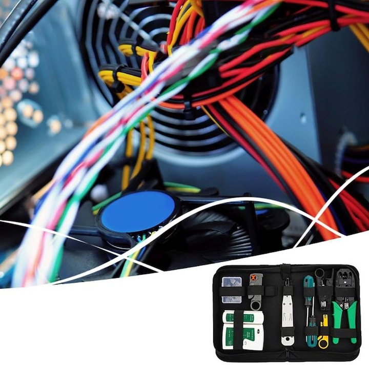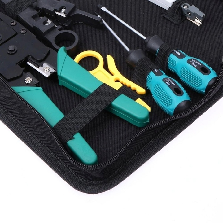 Acest set profesional de unelte pentru retea este conceput pentru instalatori, tehnicieni IT si utilizatori care doresc o solutie completa pentru montaj, verificare si intretinere cabluri UTP. Kitul include toate instrumentele esentiale pentru sertizare, testare si taiere, organizate intr-o husa compacta si rezistenta, usor de transportat in teren sau la interventii.