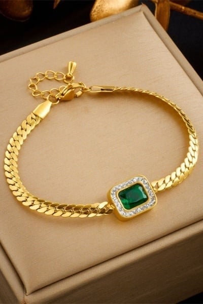 Designul său sofisticat, cu pietre centrale de culoare verde smarald înrămate de zirconii albe strălucitoare, oferă un efect vizual spectaculos. Fiecare piesă este finisată atent, cu un luciu intens auriu, potrivit atât pentru ținutele de seară, cât și pentru ocazii festive.