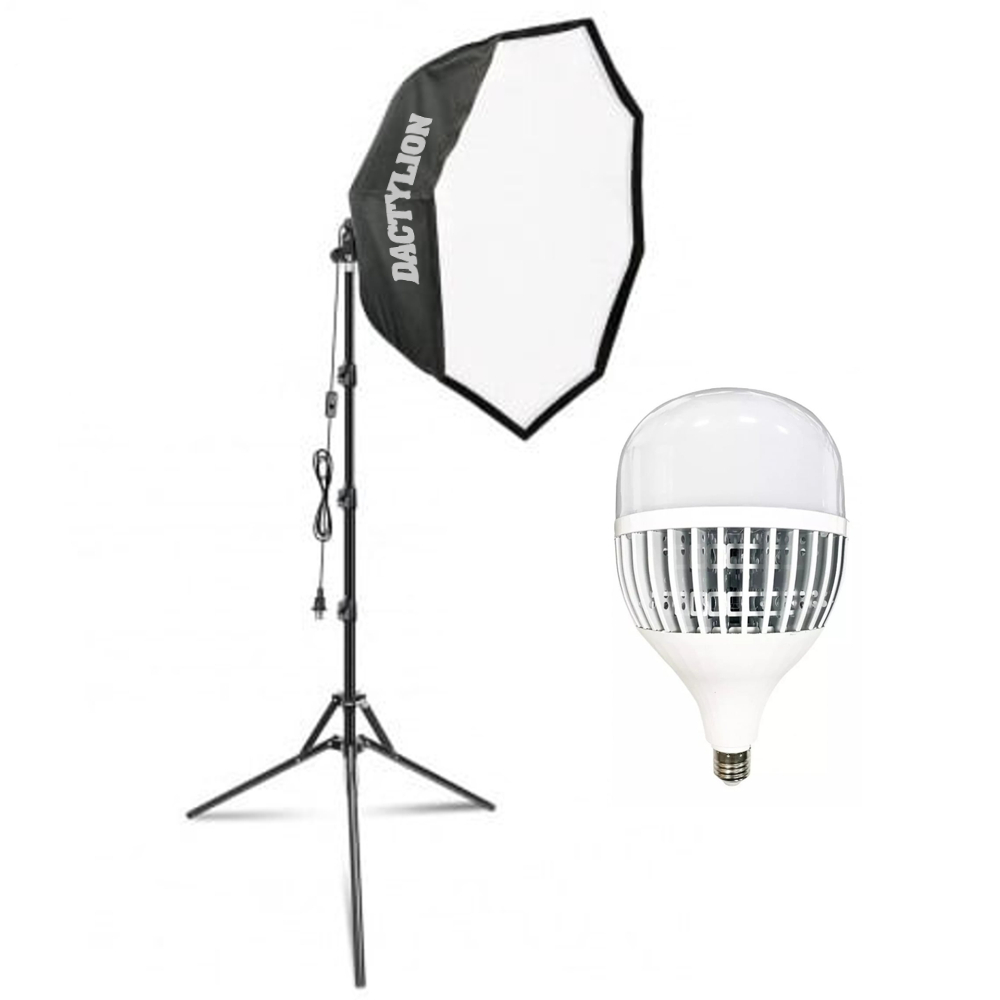 Include bec LED 6400K cu soclu E27, ce ofera lumina rece, clara si constanta, ideala pentru redarea corecta a culorilor in studio foto sau video. Temperatura de culoare 6400K este potrivita pentru fotografii de produs, interviuri si live streaming.