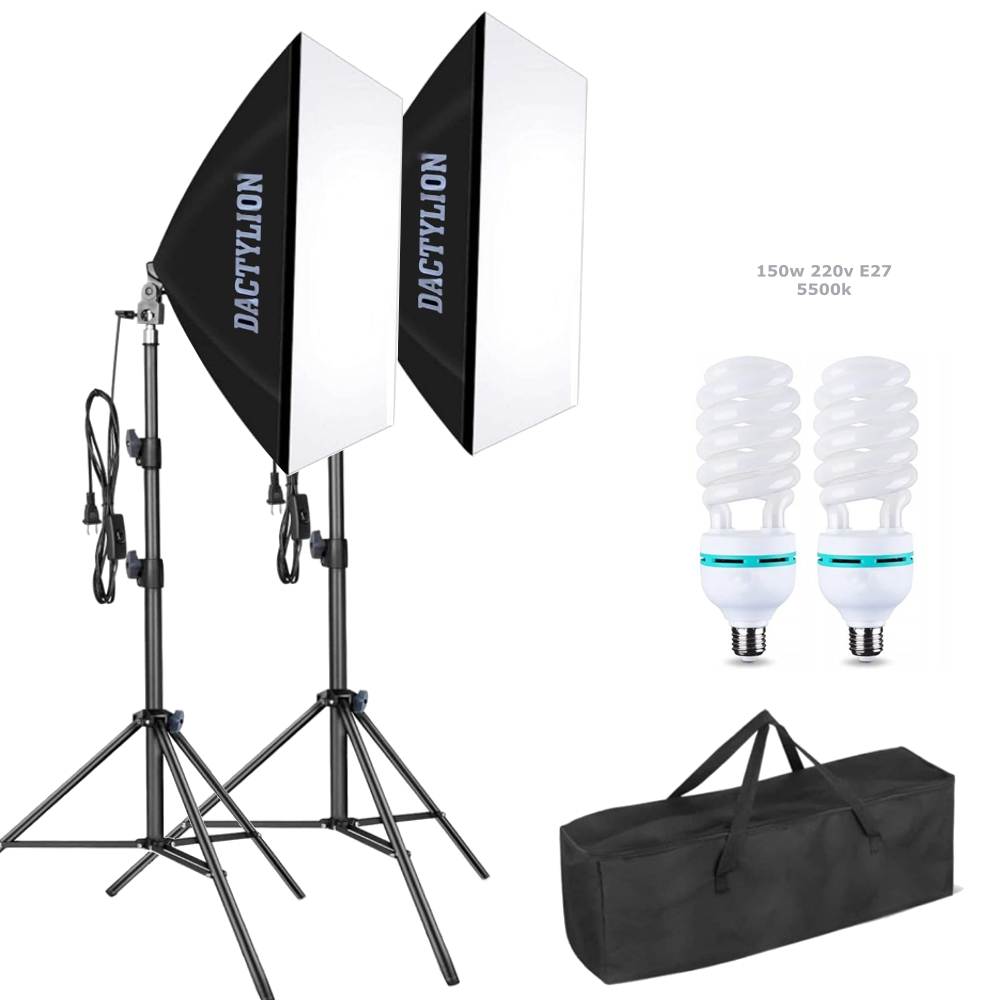 Kit Studio Foto, Set Complet Iluminat Continuu 2 x Softbox 50x70 cm, 2 x Bec 150W 5500K, 2 x Stativ Reglabil 200 cm, Geanta de Transport inclusa