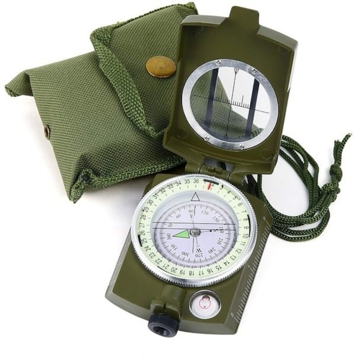 Busola militara cu capac de protectie, corp metalic, reper prismatic, cadran luminos, husa si snur incluse, ideala pentru drumetii si orientare in teren, verde militar