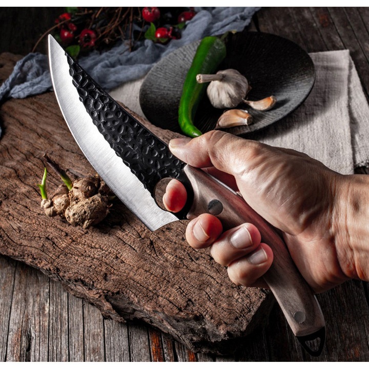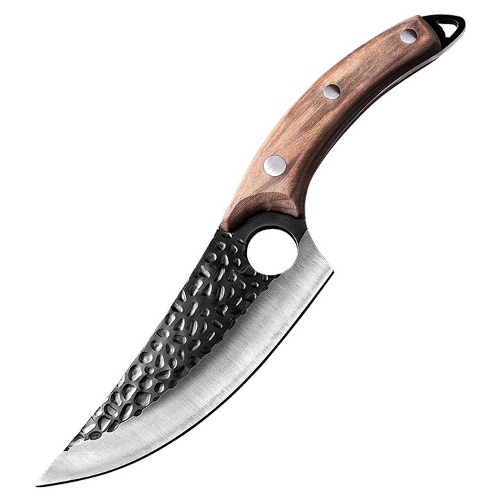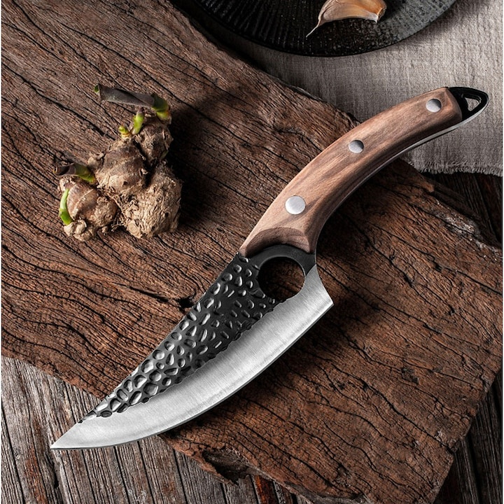 Manerul ergonomic placat cu lemn natural ofera o prindere confortabila si sigura, reducand oboseala mainii in utilizare prelungita. Cutitul este livrat impreuna cu o teaca rezistenta, care permite transportul in siguranta pe centura sau rucsac. Aspectul robust, combinat cu finisajele elegante, il face potrivit atat pentru utilizare practica, cat si ca idee de cadou pentru pasionatii de aventura.