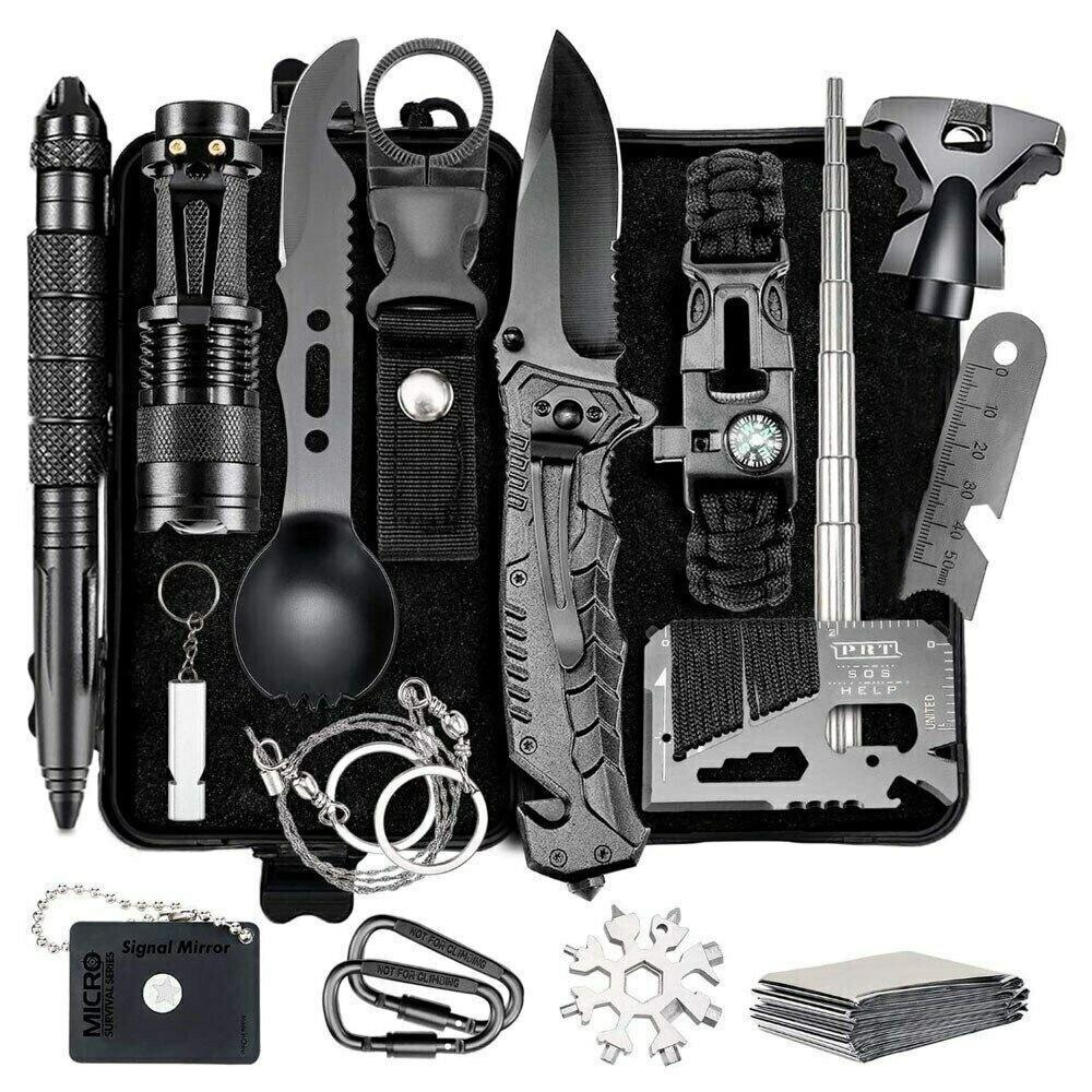 Un set complet de echipamente pentru activitati outdoor si situatii de urgenta, acest kit de supravietuire multifunctional este conceput pentru camping, drumetii, explorare sau escalada. Trusa contine instrumente utile pentru orientare, iluminare, taiere, semnalizare si alte activitati necesare in natura.