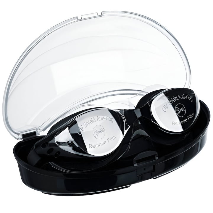 Setul este completat de dopuri de urechi moi si ajustabile si de un cleste pentru nas, accesorii esentiale pentru prevenirea patrunderii apei si cresterea confortului in timpul inotului. Pentru depozitare si transport, este inclusa o carcasa rigida, care protejeaza ochelarii impotriva zgarieturilor si deteriorarii.