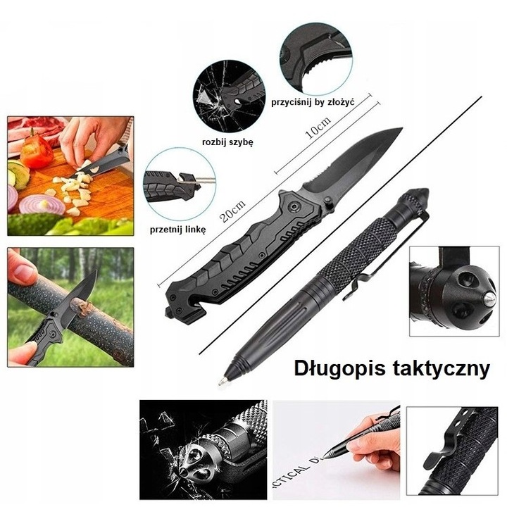 Setul este gandit pentru supravietuire, drumetii, camping, pescuit sau vanatoare, oferind atat instrumente multifunctionale, cat si accesorii de siguranta si semnalizare.