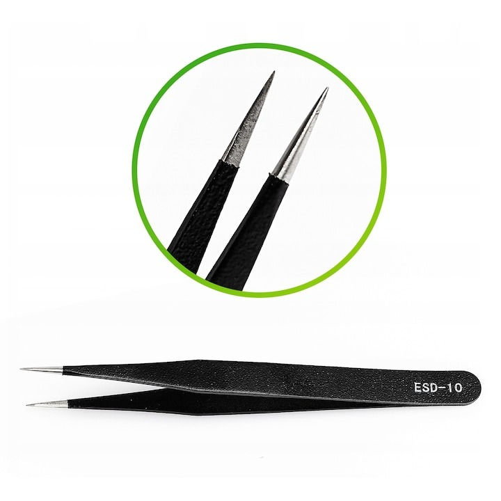 Suprafața antistatică (ESD) este una dintre cele mai importante caracteristici ale acestui instrument. În domeniul electronicii, chiar și o descărcare electrostatică minimă poate deteriora definitiv cipurile, tranzistorii sau alte componente sensibile. Penseta ESD-10 este acoperită cu un strat conductor care neutralizează electricitatea statică și permite descărcarea controlată, protejând piesele cu care se lucrează. Această proprietate face penseta ideală pentru utilizarea în ateliere profesionale, laboratoare și medii industriale.