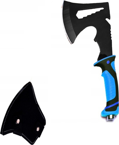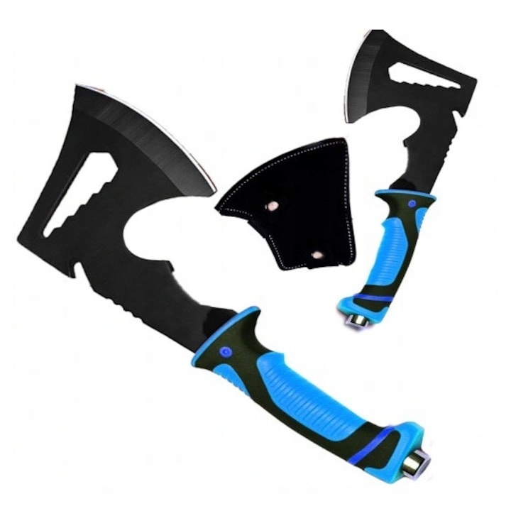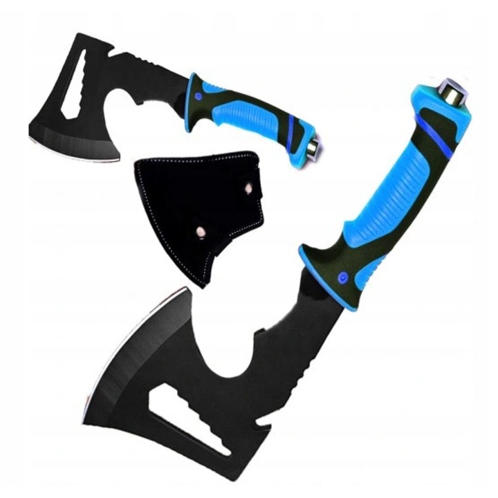 Topor tip tomahawk multifunctional pentru camping din otel 420, maner ergonomic cauciucat antialunecare, cu husa protectie, 30 cm, albastru