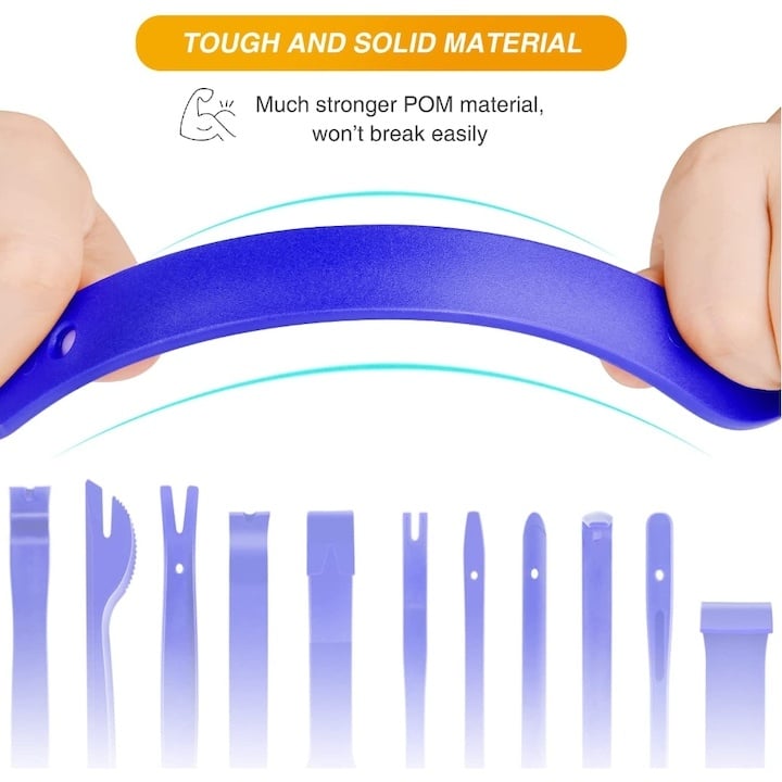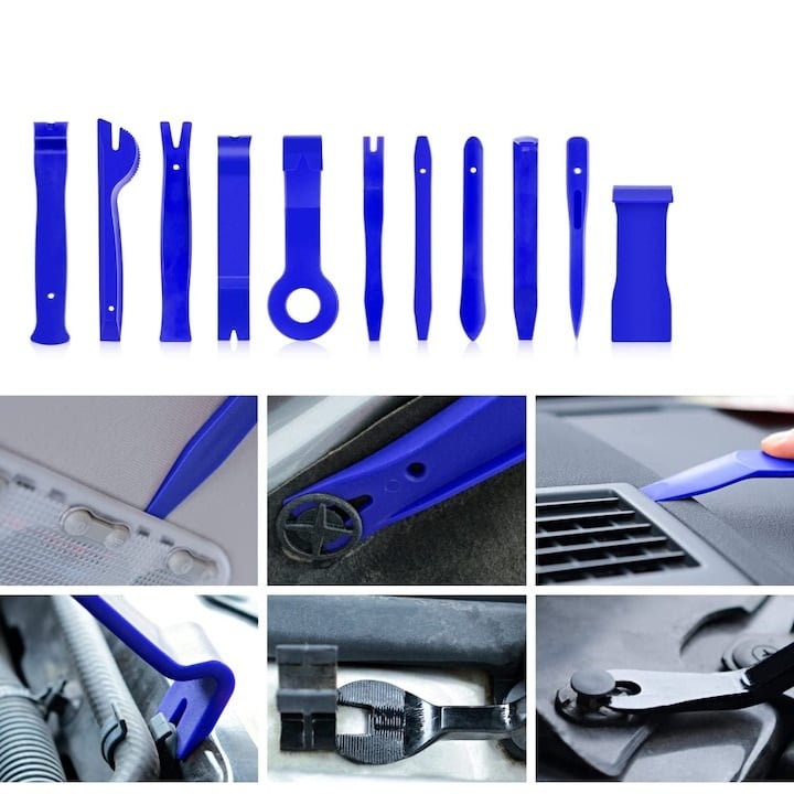 Setul include 11 instrumente cu lungimi cuprinse intre 16 si 21.5 cm, fiecare cu forma diferita, pentru a acoperi o varietate larga de operatiuni – de la scoaterea clemelor de fixare si a ornamentelor, pana la extragerea radioului sau a altor componente de interior. Culoarea albastra ajuta la identificarea rapida a pieselor in trusa de scule.