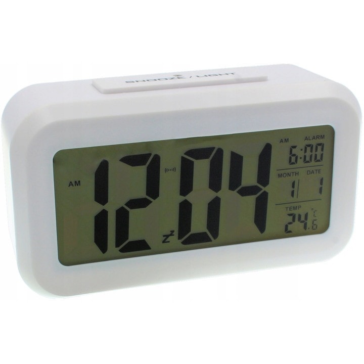 Ceas digital de masa cu alarma, afisaj 12/24h, functie de temperatura si data, senzor de lumina automat, alb – design modern si functional